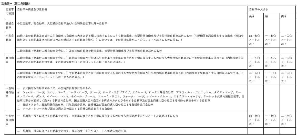 なお、参考までに、これら4つの自動車さらに細かい区分については、道路運送車両法施行規則別表第1に規定がありますので、掲載しておきます。